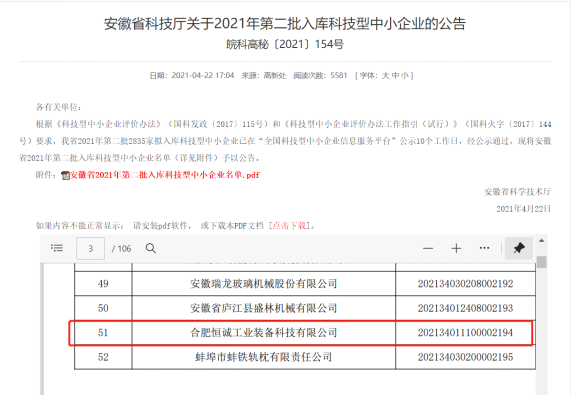 根據《科技型中小企業(yè)評價辦法》(國科發(fā)政〔2017〕115號)和《科技型中小企業(yè)評價辦法工作指引(試行)》(國科火字〔2017〕144號)要求,現認定合肥恒誠工業(yè)裝備科技有限公司成為“國家科技型中小企業(yè)”,登記編號:202134011100002194。